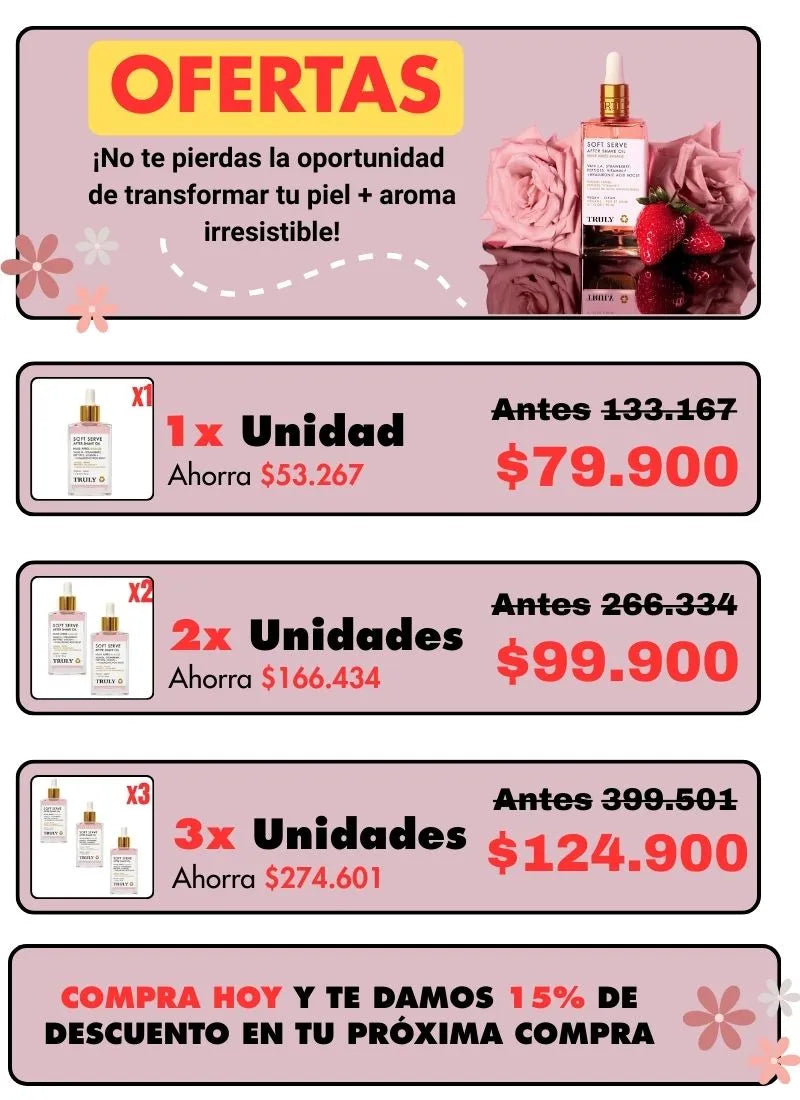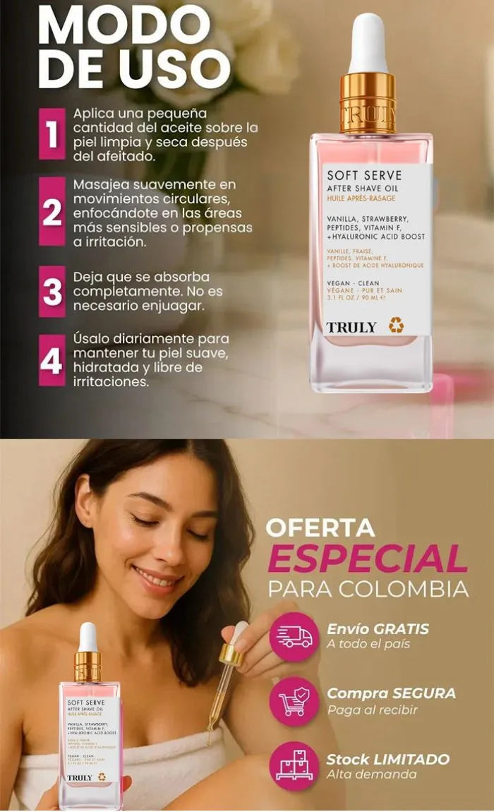 Olvida el ardor, las rojeces y la incomodidad. Con el aceite Truly, cada aplicación transforma tu piel, devolviéndote suavidad, confort y la seguridad de sentirte increíble todos los días.